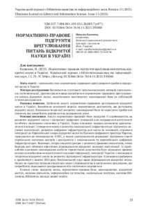 Kaliuzhna, Nataliia Нормативно-правове підгрунтя врегулювання питань відкритої науки в Україні. Український журнал з бібліотекознавства та інформаційних наук, 2025, vol. 15, pp. 23-37. [Journal article (Paginated)]