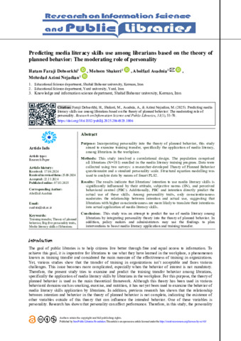 Faraji Dehsorkhi, Hatam, Shakeri, Mohsen, Asadnia, Abolfazl and Aziminejadian, Mehrdad Predicting media literacy skills use among librarians based on the theory of planned behavior: The moderating role of personality. Research on Information Science and Public Libraries, 2025, vol. 31, n. 1, pp. 53-70. [Journal article (Paginated)]