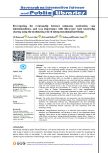 Biranvand, Ali, Jafari, Nosrat, Bohlool, Fatemeh and Samie, Mohammad Ebrahim Investigating the relationship between autonomy motivation, task interdependence, and task importance with librarians' tacit knowledge sharing using the moderating role of intergenerational knowledge. Research on Information Science and Public Libraries, 2025, vol. 31, n. 1, pp. 71-82. [Journal article (Paginated)]