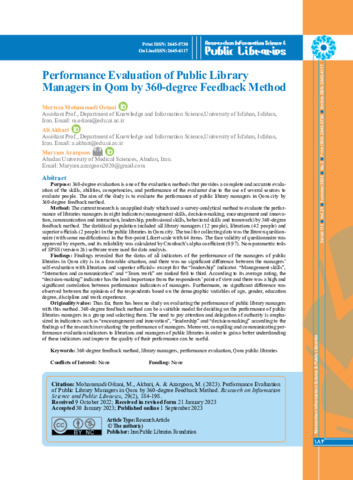 Performance Evaluation of Public LibraryManagers in Qom by 360-degree Feedback Method.pdf - Published version Available under License Creative Commons Attribution Non-commercial. Download (724kB) | Preview |