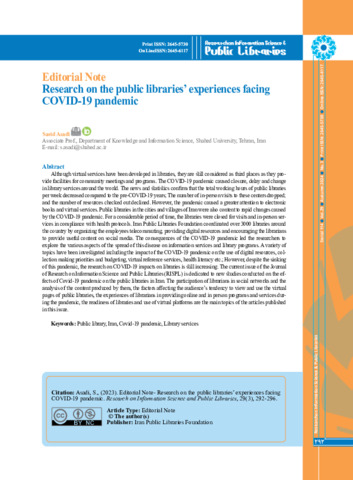 Although virtual services have been developed in libraries, they are still considered as third places as they provide facilities for community meetings and programs. The COVID-19 pandemic caused closure, delay and change in library services around the world. The news and statistics confirm that the total working hours of public libraries per week decreased compared to the pre-COVID-19 years; The number of in-person visits to these centers dropped; and the number of resources checked out declined. However, the pandemic caused a greater attention to electronic books and virtual services. Public libraries in the cities and villages of Iran were also content to rapid changes caused by the COVID-19 pandemic. For a considerable period of time, the libraries were closed for visits and in-person services in compliance with health protocols. Iran Public Libraries Foundation coordinated over 3000 libraries around the country by organizing the employees telecommuting, providing digital resources and encouraging the librarians to provide useful content on social media. The consequences of the COVID-19 pandemic led the researchers to explore the various aspects of the spread of this disease on information services and library programs. A variety of topics have been investigated including the impact of the COVID-19 pandemic on the use of digital resources, collection making priorities and budgeting, virtual reference services, health literacy etc.; However, despite the sinking of this pandemic, the research on COVID-19 impacts on libraries is still increasing. The current issue of the Journal of Research on Information Science and Public Libraries (RISPL) is dedicated to new studies conducted on the effects of Covid-19 pandemic on the public libraries in Iran. The participation of librarians in social networks and the analysis of the content produced by them, the factors affecting the audience’s tendency to view and use the virtual pages of public libraries, the experiences of librarians in providing online and in person programs and services during the pandemic, the readiness of libraries and use of virtual platforms are the main topics of the articles published in this issue.