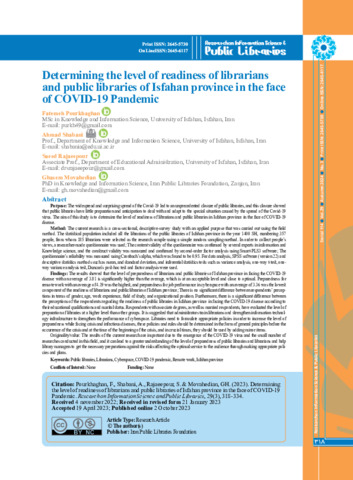 Pourkhaghan, Fatemeh, Shabani, Ahmad, Rajaeepour, Saeed and Movahedian, Ghasem Determining the level of readiness of librarians and public libraries of Isfahan province in the face of COVID-19 Pandemic. Research on Information Science and Public Libraries, 2023, vol. 29, n. 3, pp. 334-318. [Journal article (Paginated)]