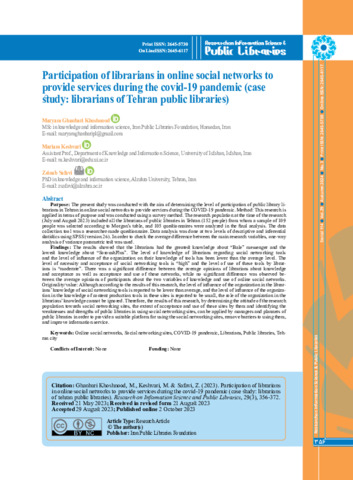 Ghanbari Khoshnood, Maryam, Keshvari, Mariam and Safavi, Zeinab Participation of librarians in online social networks to provide services during the covid-19 pandemic (case study: librarians of Tehran public libraries). Research on Information Science and Public Libraries, 2023, vol. 29, n. 3, pp. 372-356. [Journal article (Paginated)]