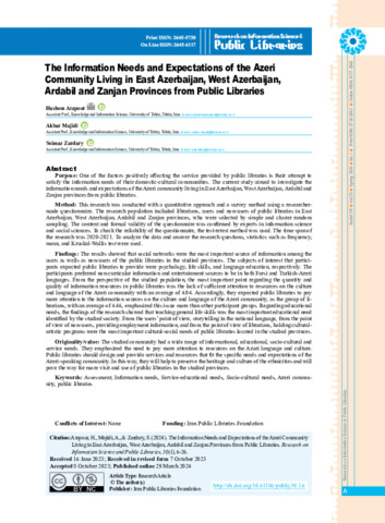 Atapour, Hashem, Majidi, Akbar and Zardary, Solmaz The Information Needs and Expectations of the Azeri Community Living in East Azerbaijan, West Azerbaijan, Ardabil and Zanjan Provinces from Public Libraries. Research on Information Science and Public Libraries, 2024, vol. 30, n. 1, pp. 26-6. [Journal article (Paginated)]