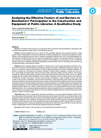 Analyzing the Effective Factors of and Barriers toBenefactors’ Participation in the Construction andEquipment of Public Libraries A Qualitative Study.pdf - Published version Available under License Creative Commons Attribution Non-commercial. Download (722kB) | Preview |