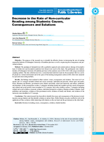 Babaee, Mazhar, Zare-Ramashti, Asra and Azizan, Kowsar Decrease in the Rate of Non-curricular Reading among Students: Causes, Consequences and Solutions. Research on Information Science and Public Libraries, 2024, vol. 30, n. 3, pp. 274-293. [Journal article (Paginated)]