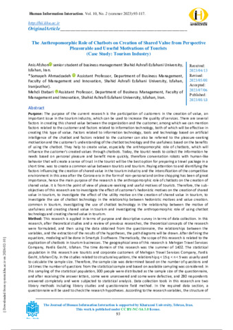 Afshoon, Anis, Ahmadzadeh, Somayeh and Etebari, Mehdi The Anthropomorphic Role of Chatbots on Creation of Shared Value from Perspective Pleasurable and Uuseful Motivations of Tourists (Case Study: Tourism Industry). Human Information Interaction, 2023, vol. 10, n. 2, pp. 93-117. [Journal article (Paginated)]