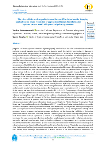 Shirmohammadi, Yazdan and Aryafard, Qasem The effect of information quality from online-to-offline-based mobile shopping applications on brand reputation of applications through the information systems success model with perceived privacy protection. Human Information Interaction, 2023, vol. 10, n. 3, pp. 58-76. [Journal article (Paginated)]
