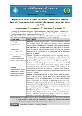 Karimi, Abolghasem, Rousta, Alireza, Ahmadi, Majid and Daniali, Saei Explaining the Impact of Market Information Learning Ability and Joint Innovative Capacities on the Organizationś Performance with an Information Approach. Human Information Interaction, 2024, vol. 11, n. 1, pp. 1-16. [Journal article (Paginated)]