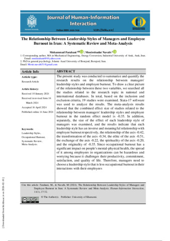 Farahani, Mohammad and Navabi, Monir Alsadat The Relationship Between Leadership Styles of Managers and Employee Burnout in Iran: A Systematic Review and Meta-Analysis. Human Information Interaction, 2024, vol. 11, n. 1, pp. 17-32. [Journal article (Paginated)]