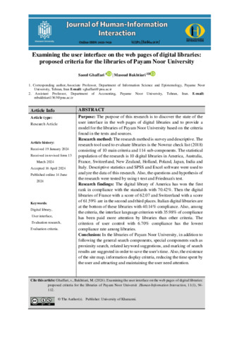 ghaffari, saeed and Bakhtiari, masou Examining the user interface on the web pages of digital libraries: proposed criteria for the libraries of Payam Noor University. Human Information Interaction, 2024, vol. 11, n. 1, pp. 94-112. [Journal article (Paginated)]