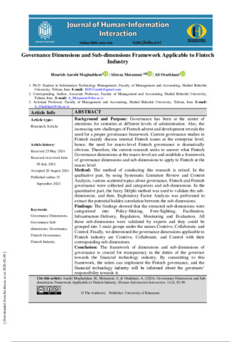 AarabiMoghaddam, Hourieh, Motameni, Alireza and Otarkhani, Ali Governance Dimensions and Sub-dimensions Framework Applicable to Fintech Industry. Human Information Interaction, 2024, vol. 11, n. 2, pp. 83-99. [Journal article (Paginated)]