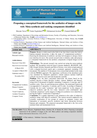 Tavosi, Maryam, Naghshineh, Nader, Zerehsaz, Mohammad and Mahboub, Siamak Proposing a conceptual framework for the aesthetics of images on the web: Meta-synthesis and ranking components identified. Human Information Interaction, 2024, vol. 11, n. 3, pp. 40-70. [Journal article (Paginated)]