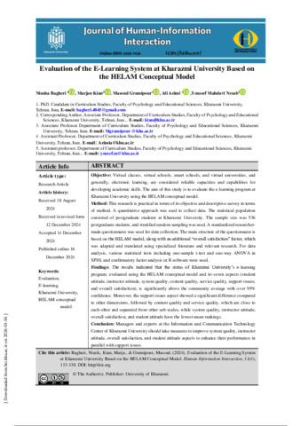 Bagheri, Niusha, Kian, Margan, Gramipour, Masoud, AliAzimi, Ali and MahdaviNesab, Youssef Evaluation of the E-Learning System at Kharazmi University Based on the HELAM Conceptual Model. Human Information Interaction, 2024, vol. 11, n. 3, pp. 113-130. [Journal article (Paginated)]