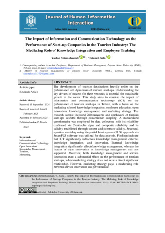Shirmohammadi, Yazdan and Safa, Fatemeh The Impact of Information and Communication Technology on the Performance of Start-up Companies in the Tourism Industry: The Mediating Role of Knowledge Integration and Employee Training. Human Information Interaction, 2025, vol. 11, n. 4, pp. 42-63. [Journal article (Paginated)]