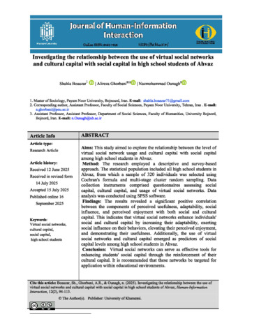 Bouazzar, Shahla, Ghorbani, Alireza and Ounagh, Nazmohamm Investigating the relationship between the use of virtual social networks and cultural capital with social capital in high school students of Ahvaz. Human Information Interaction, 2025, vol. 12, n. 2, pp. 94-113. [Journal article (Paginated)]