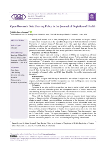 Zarea Gavgani, Vahideh Open Research Data Sharing Policy in the Journal of Depiction of Health. Depiction of Health, 2025, vol. 16, n. 4, pp. 331-333. [Journal article (Paginated)]