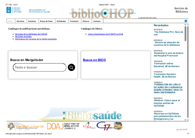 These sources detail the operation of BiblioCHOP, the digital platform of the Pontevedra Hospital Complex library, available on the intranet from 2008 to 2025. The portal offered comprehensive tools for medical research, including book catalogs, subscriptions to scientific journals, and access to specialized health databases. In addition, the site provided training resources through tutorials and courses on bibliographic resources for healthcare professionals. Users could consult electronic summaries, technical dictionaries, and various links to open access repositories. Finally, information was provided on opening hours, the location of physical reading rooms, and methods for contacting librarians directly.