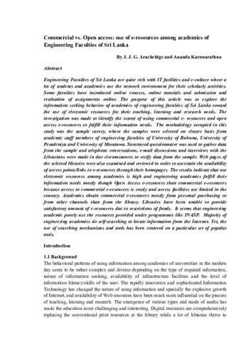 Arachchige, J J G and Karunarathna, Ananda Commercial vs. Open access: use of e-resources among academics of Engineering Faculties of Sri Lanka. National Library Review, 2014, vol. 01, n. 01, pp. 71-100. [Journal article (Paginated)]