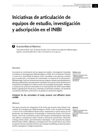 Martínez, Graciela Maricel Iniciativas de articulación de equipos de estudio, investigación y adscripción en el INIBI. Información, cultura y sociedad, 2025, n. 53, pp. 143-147. [Journal article (Paginated)]