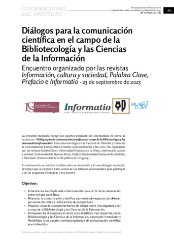This report compiles the contributions resulting from the meeting: “Dialogues for Scientific Communication in the Field of Library and Information Science.” It took place at the Facultad de Filosofía y Letras of the Universidad de Buenos Aires on Tuesday, September 23, at 7:00 p.m. It was organized by the journals Palabra Clave (Universidad Nacional de La Plata), Información, cultura y sociedad (Universidad de Buenos Aires), Prefacio (Universidad Nacional de Córdoba), and Informatio (Universidad de la República de Uruguay).