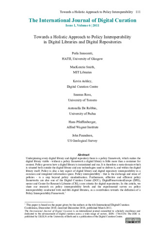 Innocenti, Perla, Smith, Mackenzie, Ashley, Kevin, Ross, Seamus, De Robbio, Antonella, Pfeiffenberger, Hans and Faundeen, John Towards a Holistic Approach to Policy Interoperability in Digital Libraries and Digital Repositories. INTERNATIONAL JOURNAL OF DIGITAL CURATION, 2011, vol. 6, n. 1, pp. 111-124. [Journal article (Unpaginated)]