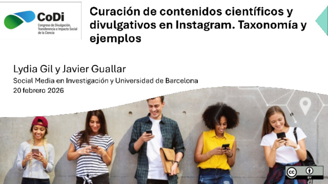 Gil, Lydia and Guallar, Javier Curación de contenidos científicos y divulgativos en Instagram. Taxonomía y ejemplos., 2026 . In II Congreso de Divulgación, Transferencia e Impacto Social de la Ciencia (CoDi), University of Barcelona, 20/02/2026. (Unpublished) [Presentation]