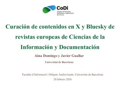 Domingo, Aina and Guallar, Javier Curación de contenidos en X y Bluesky de revistas europeas de Ciencias de la Información y Documentación., 2026 . In II Congreso de Divulgación, Transferencia e Impacto social de la ciencia (CoDi), University of Barcelona, 20/02/2026. (Unpublished) [Presentation]