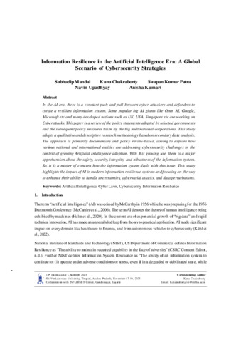 Mandal, Subhadip, Chakraborty, Kanu, Patra, Swapan Kumar, Upadhyay, Navin and Kumari, Anisha Information Resilience in the Artificial Intelligence Era: A Global Scenario of Cybersecurity Strategies., 2025 . In 14th International CALIBER 2025 Sri Venkateswara University, Tirupati, Andhra Pradesh, November 17-19, 2025 Collaboration with INFLIBNET Centre, Gandhinagar, Gujarat, 14th International CALIBER 2025 Sri Venkateswara University, Tirupati, Andhra Pradesh, November 17-19, 2025. [Conference paper]
