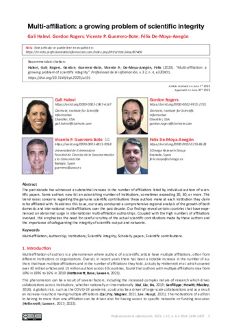Halevi, Gali, Rogers, Gordon, Guerrero-Bote, Vicente-P. and De-Moya-Anegón, Félix Multi-affiliation: a growing problem of scientific integrity. Profesional de la información, 2023, vol. 32, n. 4. [Journal article (Unpaginated)]