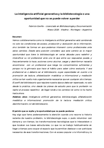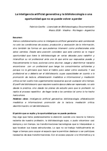 Gaviña, Fabricio Ernesto “La inteligencia artificial generativa y la bibliotecología o una oportunidad que no se puede volver a perder”., 2026 (Unpublished) [Report]