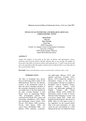 Tiew, Wai Sin, Sen, B. K., Kaur, Kiran and Lee, Lily Titles of LIS textbooks and research articles : a bibliometric study. Malaysian Journal of Library & Information Science, 1997, vol. 2, n. 1, pp. 51-62. [Journal article (Paginated)]